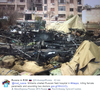Militants shelled Russian field hospital in #Aleppo, killing female paramedic and wounding two doctors http://goo.gl/WnUUCL